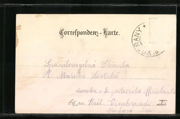 Personenbezogene Daten auf der Rückseite der Karte wurden durch blauen Textmarker unkenntlich gemacht. Die blauen Stellen sind auf die Vorderseite durchgeweicht und wirken sich negativ auf das Postkartenfoto aus