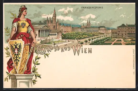 Lithographie Wien, Blick über den Franzensring, Wappen