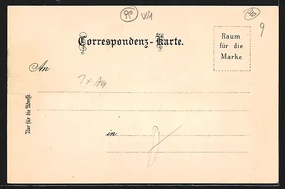 Personenbezogene Daten auf der Rückseite der Karte wurden durch blauen Textmarker unkenntlich gemacht. Die blauen Stellen sind auf die Vorderseite durchgeweicht und wirken sich negativ auf das Postkartenfoto aus