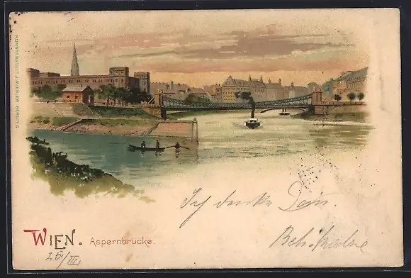 Lithographie Wien, Blick zur Aspernbrücke, Dampfer, Ruderboote