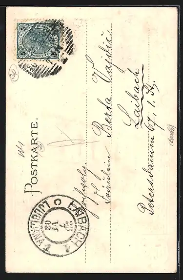 Personenbezogene Daten auf der Rückseite der Karte wurden durch blauen Textmarker unkenntlich gemacht. Die blauen Stellen sind auf die Vorderseite durchgeweicht und wirken sich negativ auf das Postkartenfoto aus