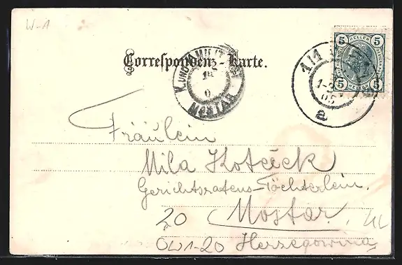 Personenbezogene Daten auf der Rückseite der Karte wurden durch blauen Textmarker unkenntlich gemacht. Die blauen Stellen sind auf die Vorderseite durchgeweicht und wirken sich negativ auf das Postkartenfoto aus