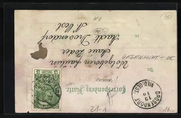 Personenbezogene Daten auf der Rückseite der Karte wurden durch blauen Textmarker unkenntlich gemacht. Die blauen Stellen sind auf die Vorderseite durchgeweicht und wirken sich negativ auf das Postkartenfoto aus
