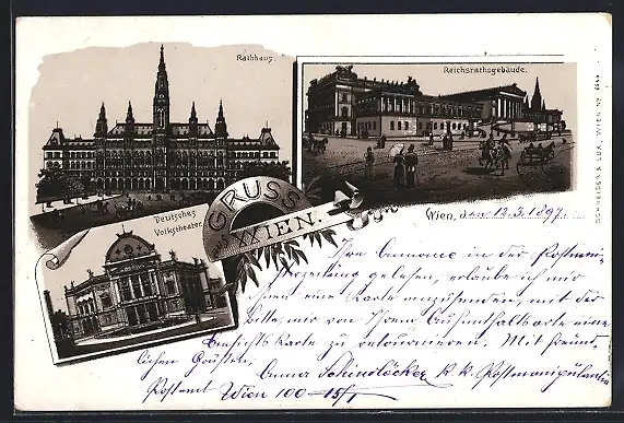 Lithographie Wien, Deutsches Volkstheater, Rathhaus und Reichsrathsgebäude