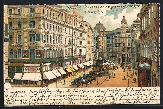 Lithographie Wien, Graben, Strassenpartie mit Geschäften