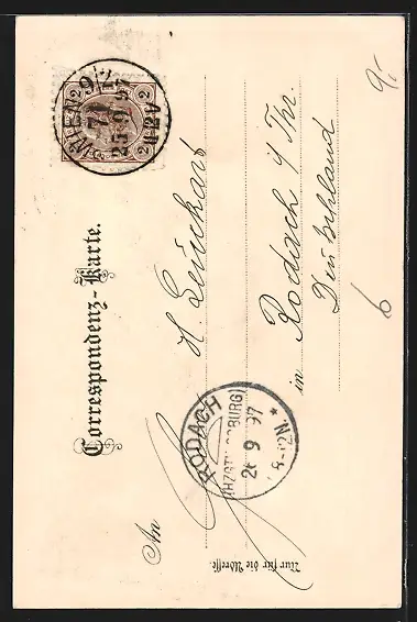 Personenbezogene Daten auf der Rückseite der Karte wurden durch blauen Textmarker unkenntlich gemacht. Die blauen Stellen sind auf die Vorderseite durchgeweicht und wirken sich negativ auf das Postkartenfoto aus