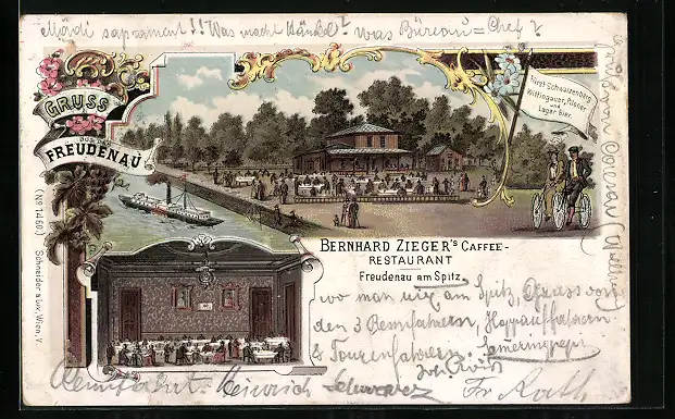 Lithographie Wien II, Gerhard Zieger`s Caffee Restaurant m. Dampfer, Freuden am Spitz