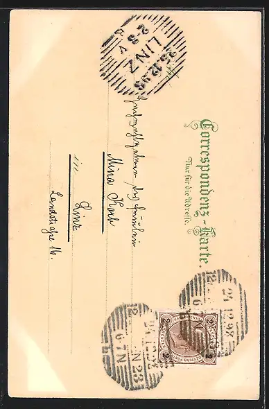 Personenbezogene Daten auf der Rückseite der Karte wurden durch blauen Textmarker unkenntlich gemacht. Die blauen Stellen sind auf die Vorderseite durchgeweicht und wirken sich negativ auf das Postkartenfoto aus