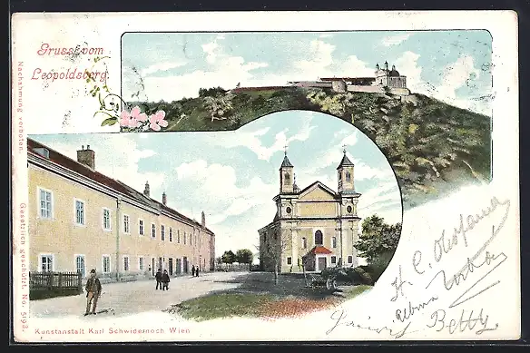 Lithographie Wien, Leopoldsberg, Partie mit Kirche