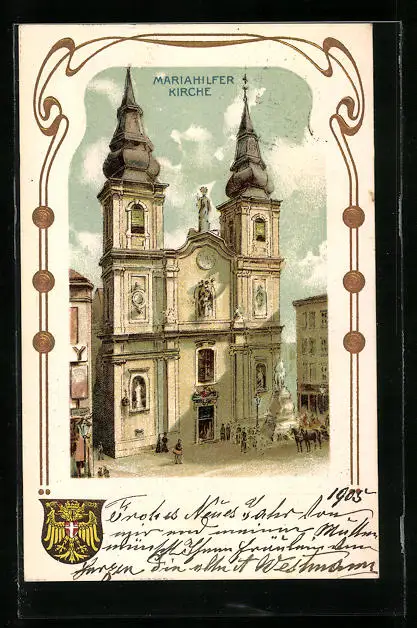 Lithographie Wien, Mariahilfer Kirche mit Vorplatz