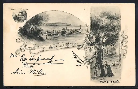 Personenbezogene Daten auf der Rückseite der Karte wurden durch blauen Textmarker unkenntlich gemacht. Die blauen Stellen sind auf die Vorderseite durchgeweicht und wirken sich negativ auf das Postkartenfoto aus