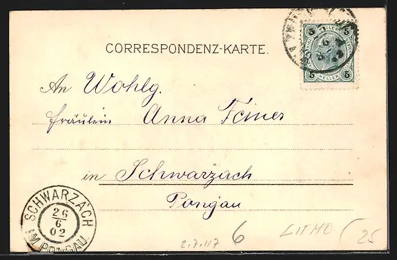 Personenbezogene Daten auf der Rückseite der Karte wurden durch blauen Textmarker unkenntlich gemacht. Die blauen Stellen sind auf die Vorderseite durchgeweicht und wirken sich negativ auf das Postkartenfoto aus