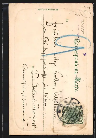 Personenbezogene Daten auf der Rückseite der Karte wurden durch blauen Textmarker unkenntlich gemacht. Die blauen Stellen sind auf die Vorderseite durchgeweicht und wirken sich negativ auf das Postkartenfoto aus