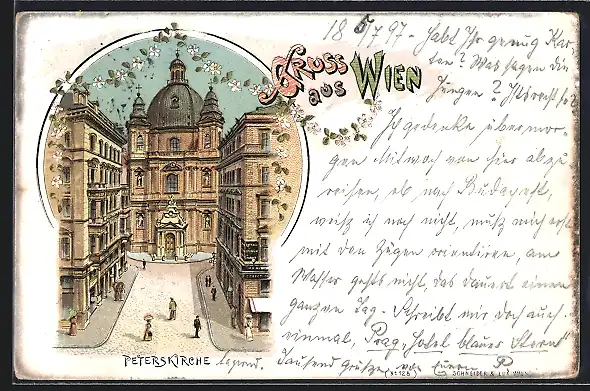 Lithographie Wien, Peterskirche mit Strassenpartie
