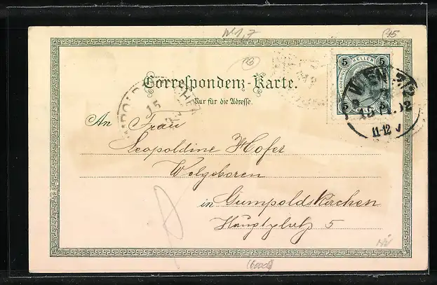 Personenbezogene Daten auf der Rückseite der Karte wurden durch blauen Textmarker unkenntlich gemacht. Die blauen Stellen sind auf die Vorderseite durchgeweicht und wirken sich negativ auf das Postkartenfoto aus
