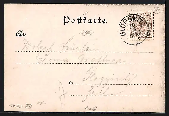 Personenbezogene Daten auf der Rückseite der Karte wurden durch blauen Textmarker unkenntlich gemacht. Die blauen Stellen sind auf die Vorderseite durchgeweicht und wirken sich negativ auf das Postkartenfoto aus