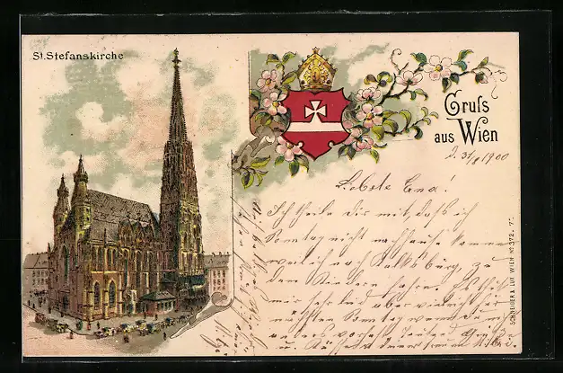 Lithographie Wien, St. Stefanskirche mit Wappen