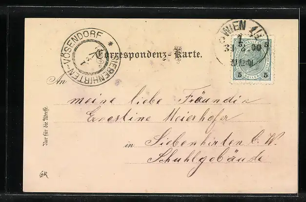 Personenbezogene Daten auf der Rückseite der Karte wurden durch blauen Textmarker unkenntlich gemacht. Die blauen Stellen sind auf die Vorderseite durchgeweicht und wirken sich negativ auf das Postkartenfoto aus