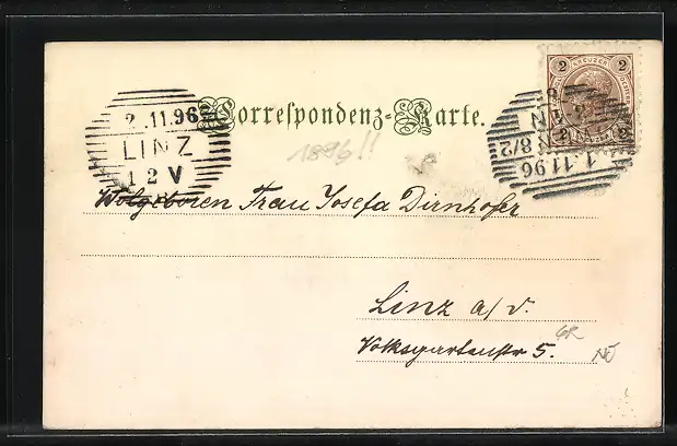 Personenbezogene Daten auf der Rückseite der Karte wurden durch blauen Textmarker unkenntlich gemacht. Die blauen Stellen sind auf die Vorderseite durchgeweicht und wirken sich negativ auf das Postkartenfoto aus