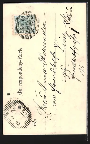 Personenbezogene Daten auf der Rückseite der Karte wurden durch blauen Textmarker unkenntlich gemacht. Die blauen Stellen sind auf die Vorderseite durchgeweicht und wirken sich negativ auf das Postkartenfoto aus