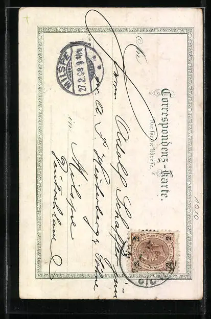 Personenbezogene Daten auf der Rückseite der Karte wurden durch blauen Textmarker unkenntlich gemacht. Die blauen Stellen sind auf die Vorderseite durchgeweicht und wirken sich negativ auf das Postkartenfoto aus