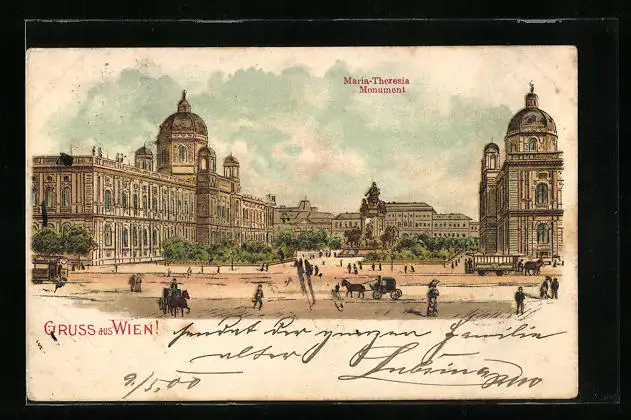 Lithographie Wien, Strassenpartie mit Blick auf Maria Theresia Monument