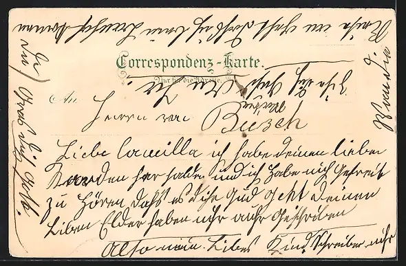 Personenbezogene Daten auf der Rückseite der Karte wurden durch blauen Textmarker unkenntlich gemacht. Die blauen Stellen sind auf die Vorderseite durchgeweicht und wirken sich negativ auf das Postkartenfoto aus