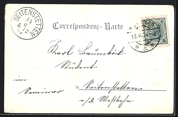 Personenbezogene Daten auf der Rückseite der Karte wurden durch blauen Textmarker unkenntlich gemacht. Die blauen Stellen sind auf die Vorderseite durchgeweicht und wirken sich negativ auf das Postkartenfoto aus