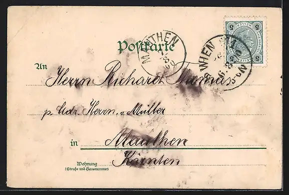 Personenbezogene Daten auf der Rückseite der Karte wurden durch blauen Textmarker unkenntlich gemacht. Die blauen Stellen sind auf die Vorderseite durchgeweicht und wirken sich negativ auf das Postkartenfoto aus