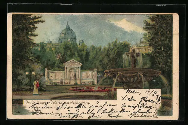 Lithographie Wien, das Grillparzer Denkmal im Volksgarten