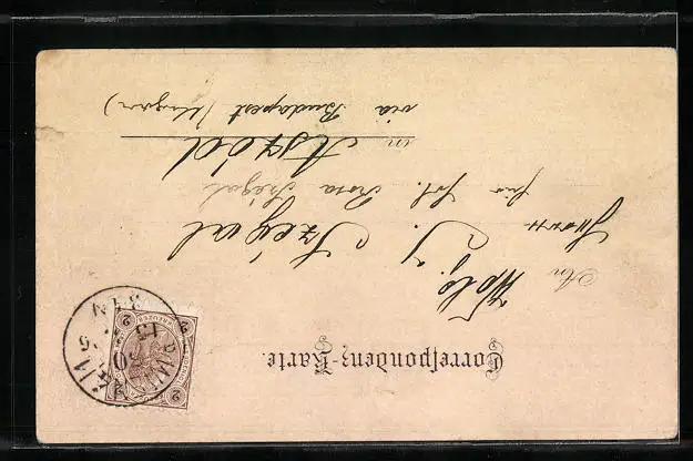 Personenbezogene Daten auf der Rückseite der Karte wurden durch blauen Textmarker unkenntlich gemacht. Die blauen Stellen sind auf die Vorderseite durchgeweicht und wirken sich negativ auf das Postkartenfoto aus