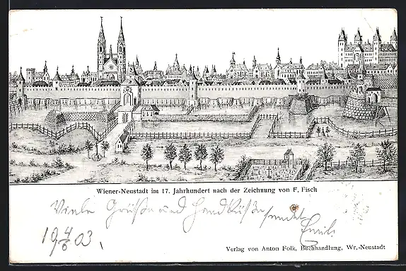Lithographie Wiener-Neustadt, Teilansicht mit Kirche im 17. Jahrhundert