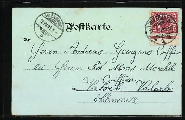 Personenbezogene Daten auf der Rückseite der Karte wurden durch blauen Textmarker unkenntlich gemacht. Die blauen Stellen sind auf die Vorderseite durchgeweicht und wirken sich negativ auf das Postkartenfoto aus