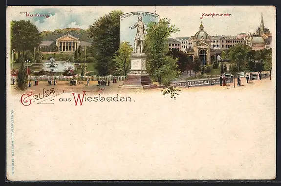 Lithographie Wiesbaden, Kochbrunnen und Kurhaus