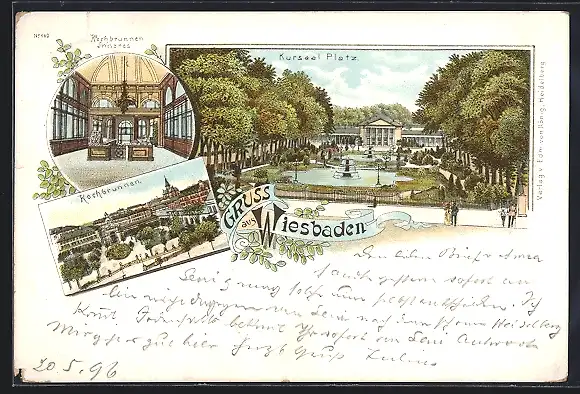 Lithographie Wiesbaden, Kursaal Platz, Kochbrunnen, Innenansicht