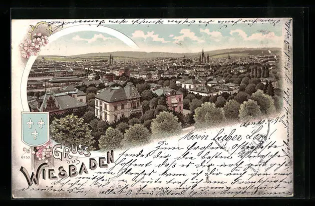 Lithographie Wiesbaden, Ortsansicht aus der Vogelschau