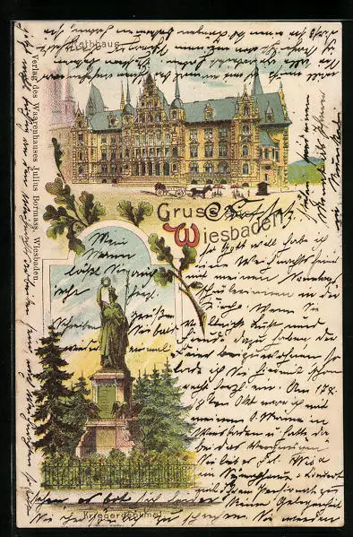 Lithographie Wiesbaden, Rathaus, Kriegerdenkmal