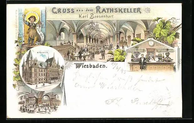 Lithographie Wiesbaden, Rathaus mit Gasthaus Ratskeller, Innenansichten