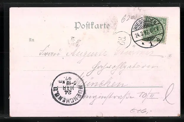 Personenbezogene Daten auf der Rückseite der Karte wurden durch blauen Textmarker unkenntlich gemacht. Die blauen Stellen sind auf die Vorderseite durchgeweicht und wirken sich negativ auf das Postkartenfoto aus
