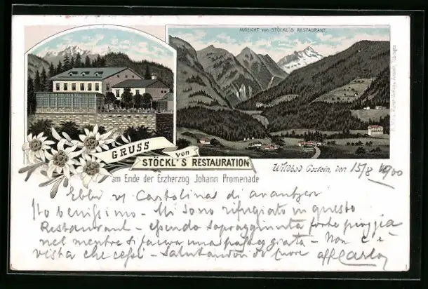 Lithographie Wildbad Gastein, Stöckls Restauration, Ortsansicht von Stöckls Restaurant
