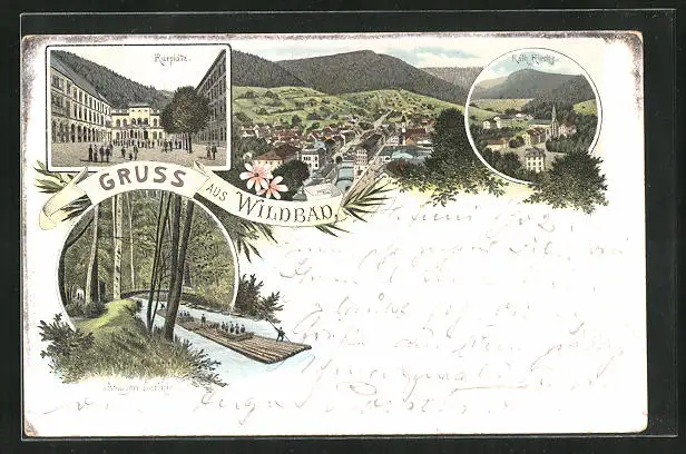 Lithographie Wildbad, Kurplatz, Katholische Kirche, Anlagen Partie mit Floss