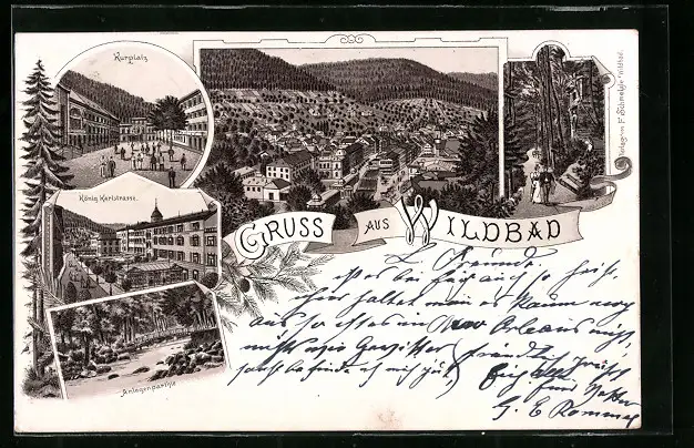 Lithographie Wildbad, Kurplatz, König Karlstrasse, Anlagenpartie