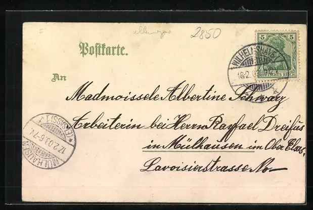 Personenbezogene Daten auf der Rückseite der Karte wurden durch blauen Textmarker unkenntlich gemacht. Die blauen Stellen sind auf die Vorderseite durchgeweicht und wirken sich negativ auf das Postkartenfoto aus