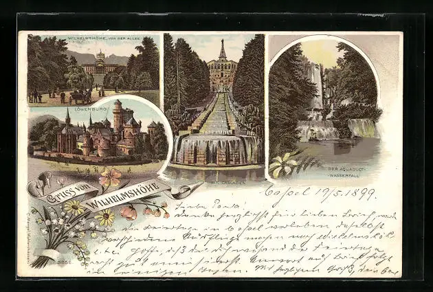 Lithographie Wilhelmshöhe, Löwenburg, Die Cascaden, Aquaduct-Wasserfall