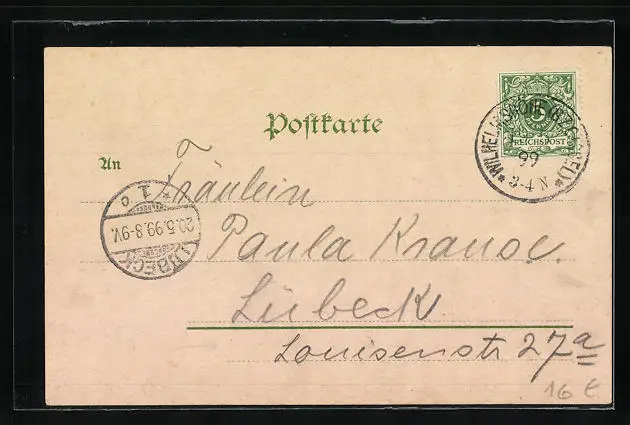 Personenbezogene Daten auf der Rückseite der Karte wurden durch blauen Textmarker unkenntlich gemacht. Die blauen Stellen sind auf die Vorderseite durchgeweicht und wirken sich negativ auf das Postkartenfoto aus
