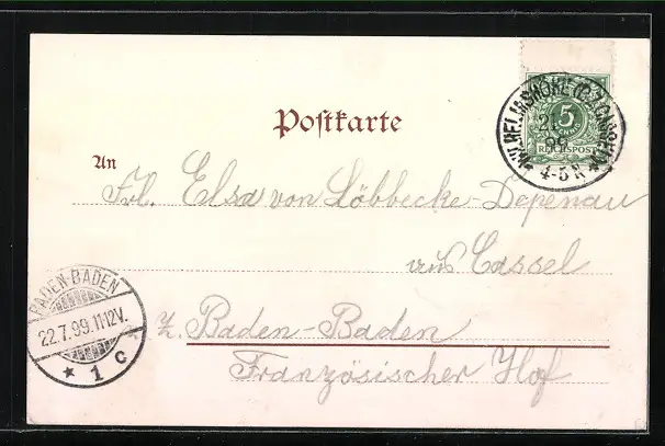 Personenbezogene Daten auf der Rückseite der Karte wurden durch blauen Textmarker unkenntlich gemacht. Die blauen Stellen sind auf die Vorderseite durchgeweicht und wirken sich negativ auf das Postkartenfoto aus