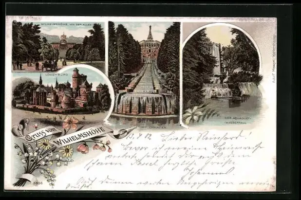 Lithographie Wilhelmshöhe, Löwenburg mit Wasserfall