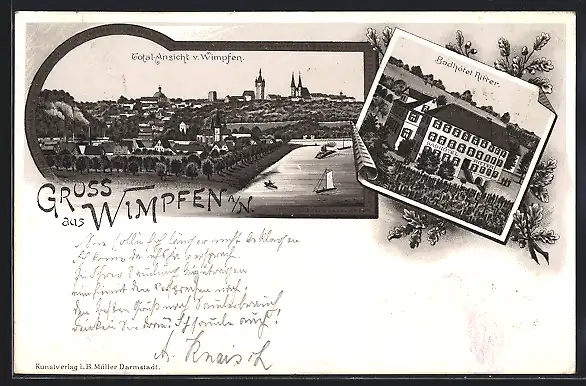 Lithographie Wimpfen a. N., Badhotel Ritter, Totalansicht der Stadt