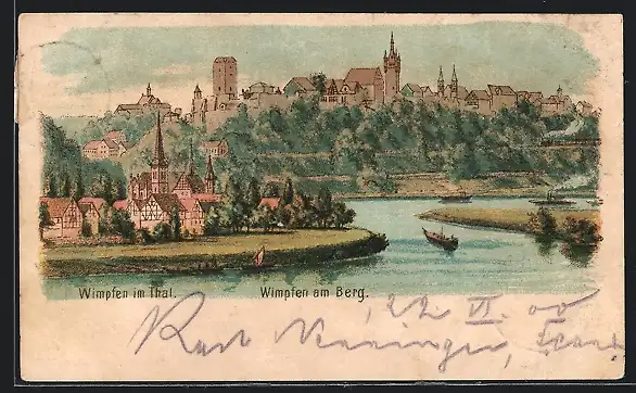 Lithographie Wimpfen am Berg, Teilansicht mit Kirche