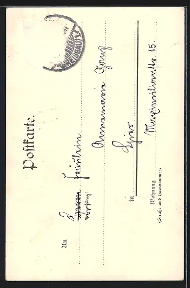 Personenbezogene Daten auf der Rückseite der Karte wurden durch blauen Textmarker unkenntlich gemacht. Die blauen Stellen sind auf die Vorderseite durchgeweicht und wirken sich negativ auf das Postkartenfoto aus